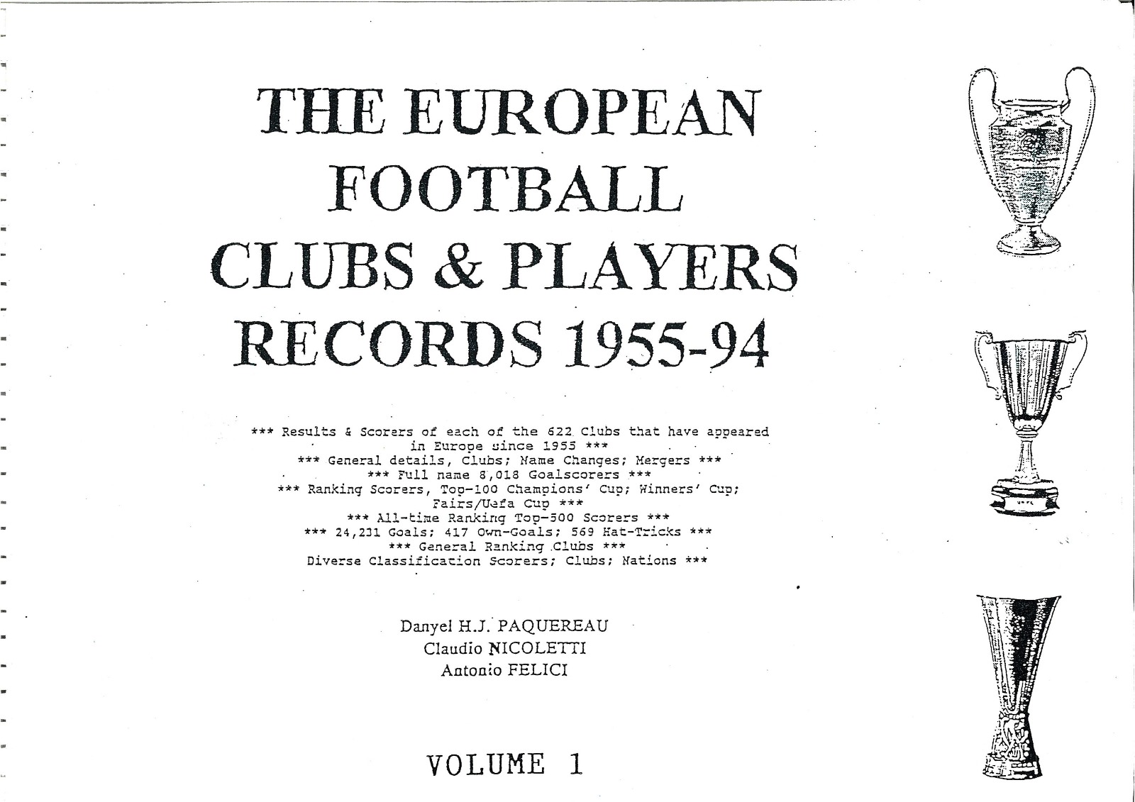 THE EUROPEAN FOOTBALL CLUBS & PLAYERS RECORD 1955-1994 vol. 1